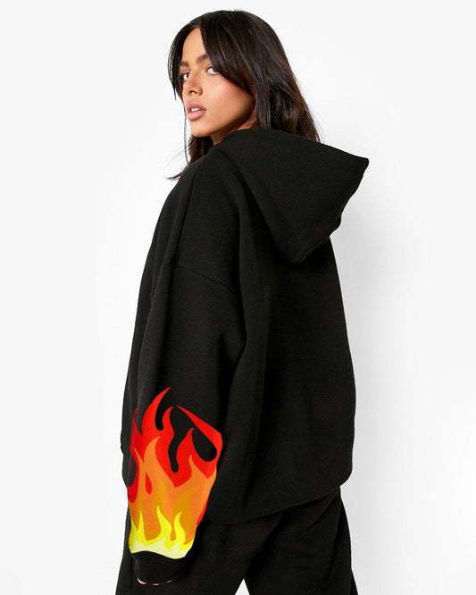 Luxurious Style:Women's Black Fire Hoodie with Oversized Hood