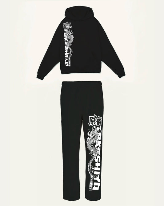 Men's Japanese Dragon Hoodie Oversized Co-ord Set - Black and Black