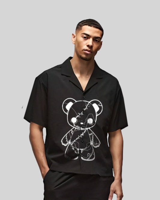 Damaged Teddy Half Sleeve Black Oversized Knitted Shirt