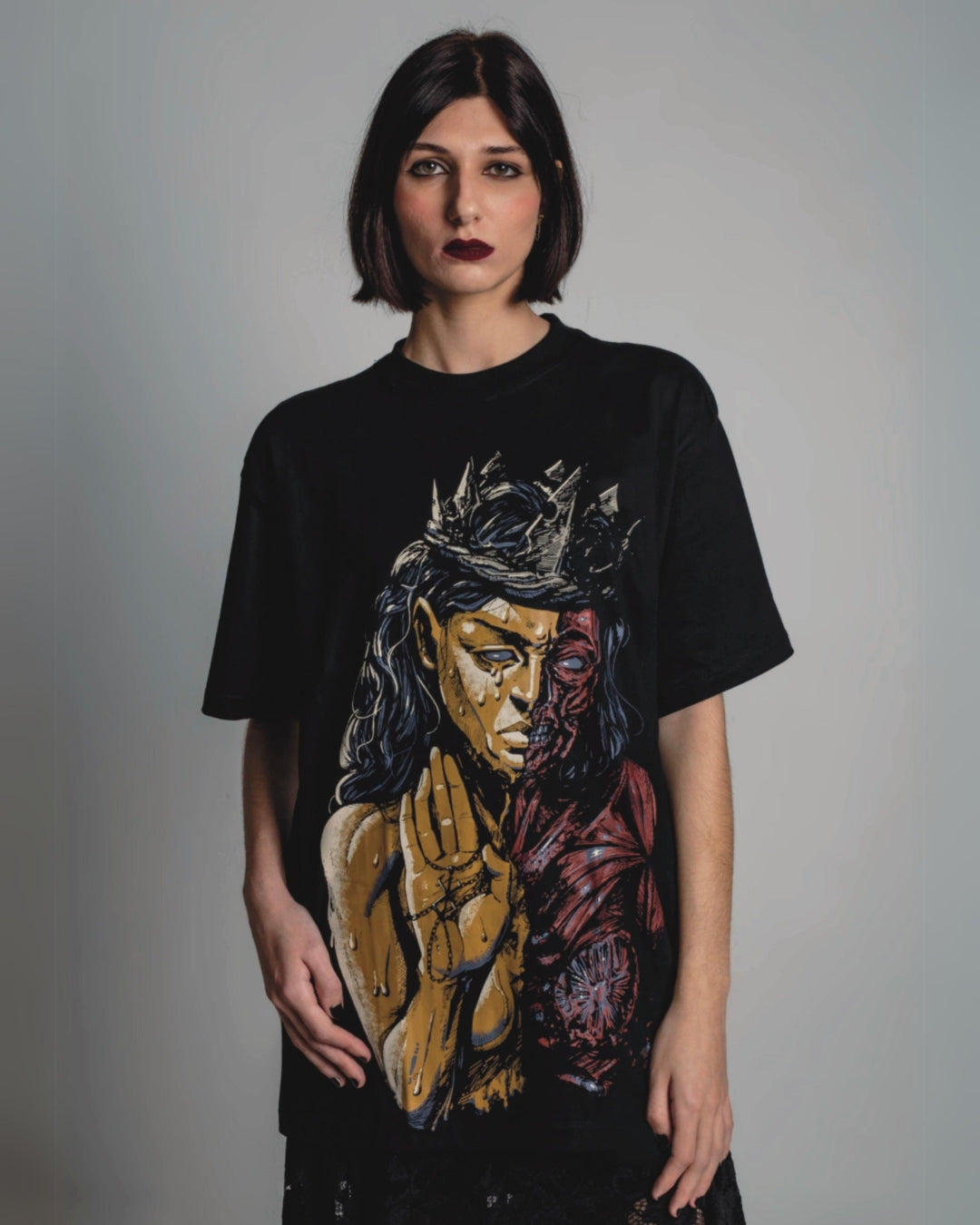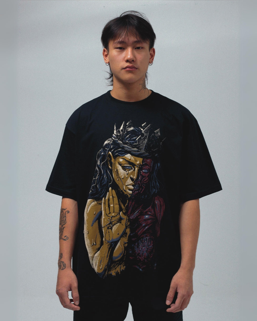 The unisex oversized t-shirt is a popular pick among guys. It's a bit bigger than a regular t-shirt, giving you extra comfort. You can wear it at home, when hanging out with friends, or even for sleeping. It's super cozy and keeps your style on point. You can layer it up by adding a sleeveless jacket on top and pairing it with snug bottoms. Or, wear a full-sleeved shirt or tee underneath, or tuck it in for a neat look. Want to spice things up? Add accessories like chains, scarves, sling bags, bandanas, or hats.