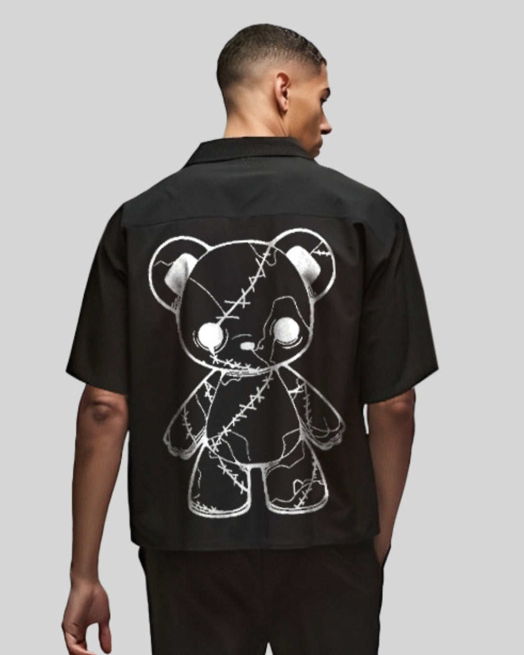 Damaged Teddy Half Sleeve Black Oversized Knitted Shirt