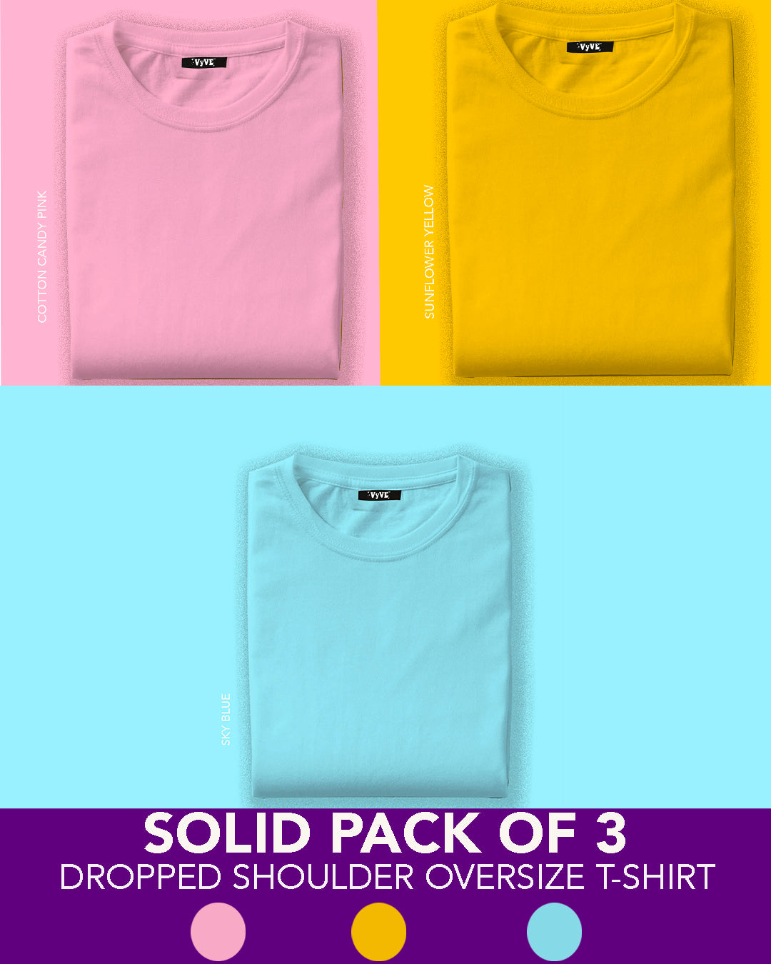 Solids Pack of 3: Urban Oversized T Shirts - Pink, Blue, Yellow