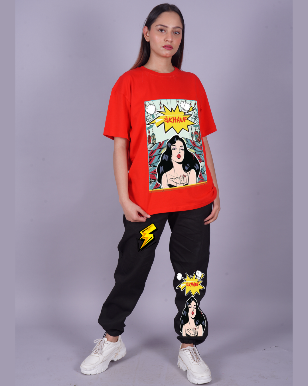 Women Bekhauf Graphic Oversized Co-Ord Set - Red and Black