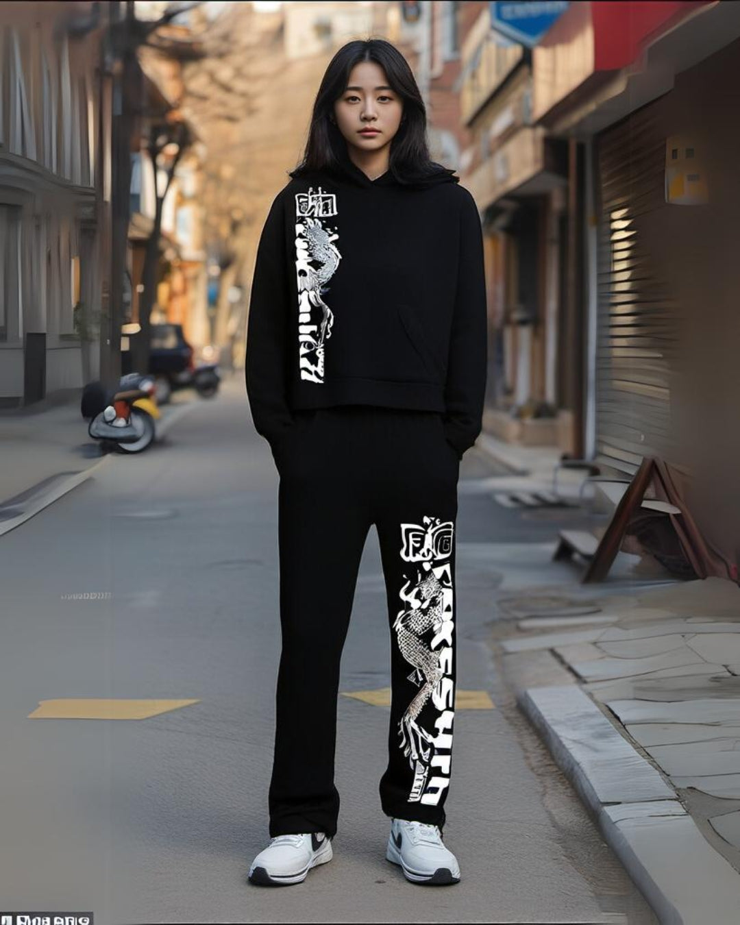 Women Japanese Dragon Hoodie Oversized Co-ord Set - Black and Black
