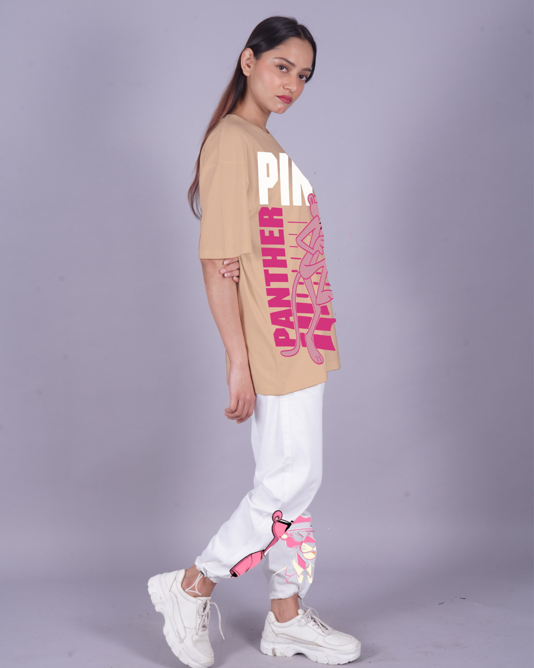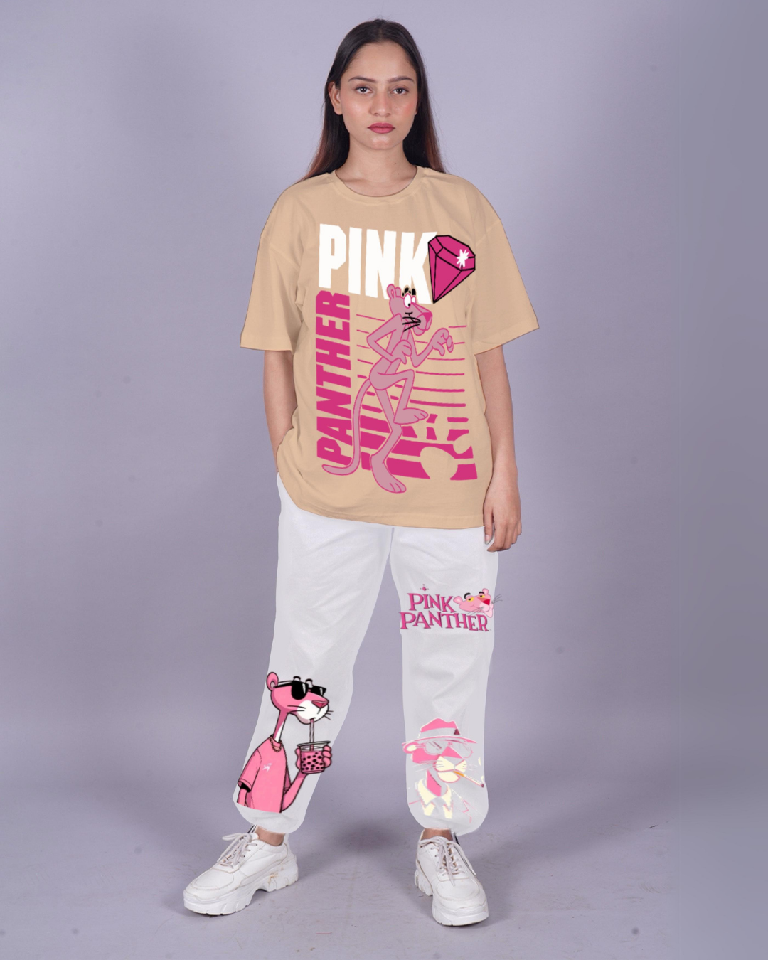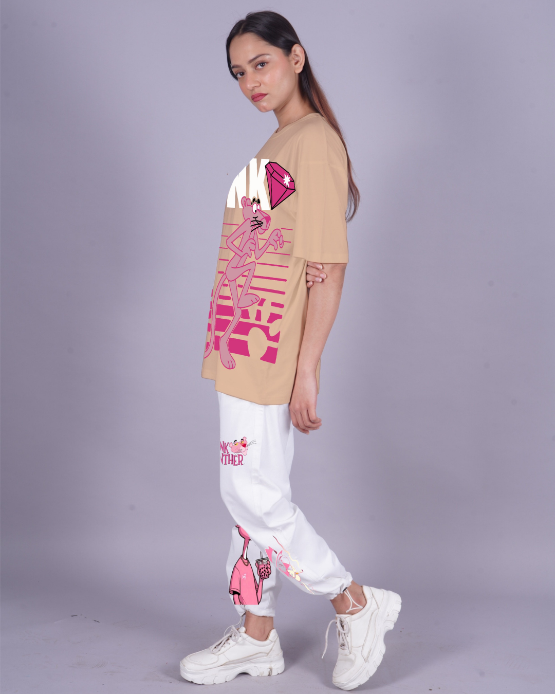 Women Pink Panther Oversized Co-Ord Set - Beige and White