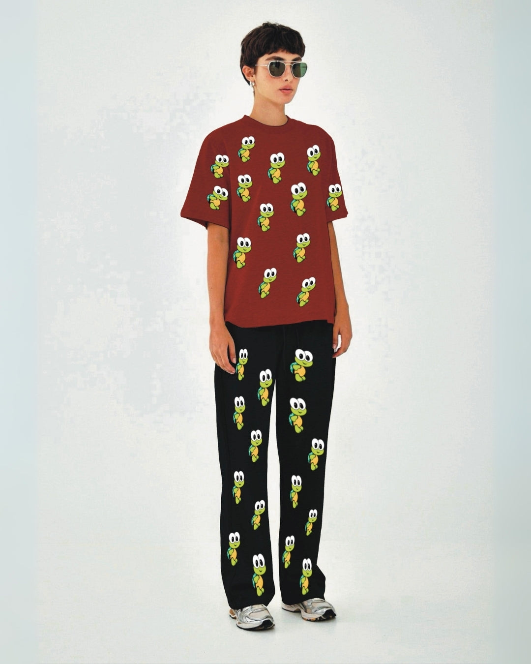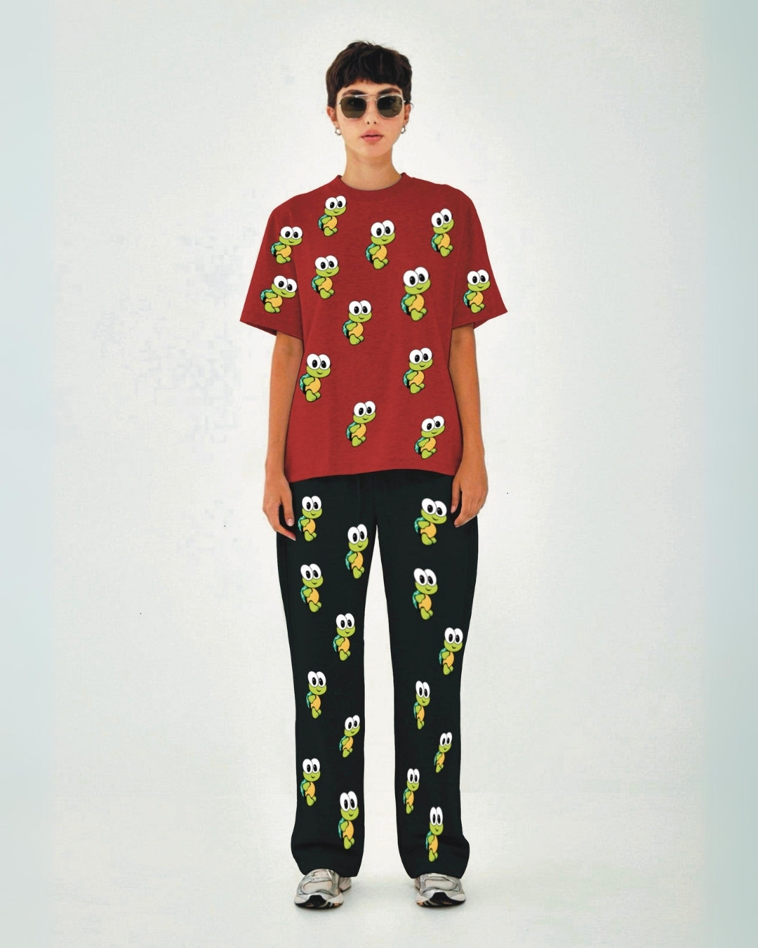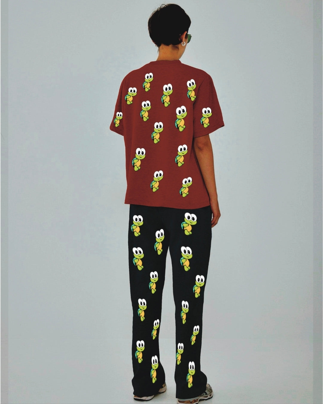 Women Turtle World Oversized Co-Ord Set - Red and Black